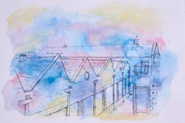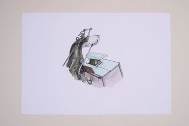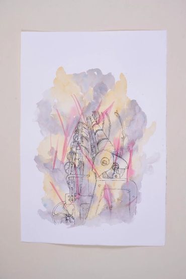 I've produced a series of layered sketches that show the complex narrative of disabled people in the world of the industrial revolution. I’ve made drawings of the workplaces themselves to represent where disabled people “existed” and the machinery they worked on that gave them social value. Interspersed and layered over the drawings are abstract watercolours that depict concepts such as my own emotions and responses to the research.